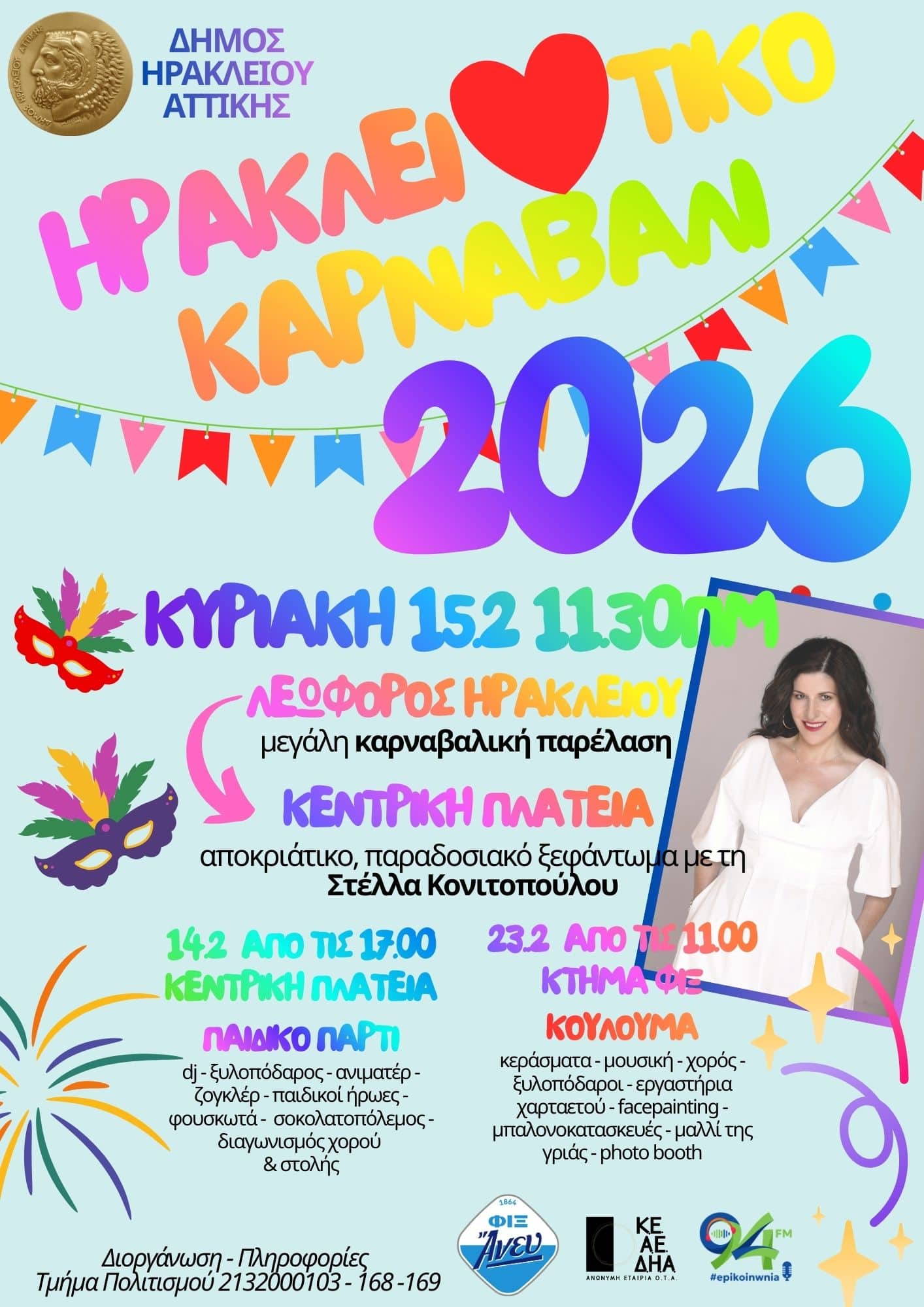 «Το Ηράκλειο φορά τα αποκριάτικά του και γεμίζει χαμόγελα, χρώματα και μουσικές. Μικροί και μεγάλοι, οικογένειες, φίλοι και παρέες, σας προσκαλούμε να ζήσετε από κοντά τις καρναβαλικές μας εκδηλώσεις, να συμμετάσχετε στην αποκριάτικη παρέλαση και να διασκεδάσετε στη μεγάλη γιορτή με μουσική που θα ακολουθήσει στην κεντρική πλατεία της πόλης. Ελάτε να γεμίσουμε τους δρόμους με κέφι, ρυθμό και αισιοδοξία, να χορέψουμε, να τραγουδήσουμε και να γιορτάσουμε όλοι μαζί. Η πόλη μας γιορτάζει – και αυτή η γιορτή είναι για όλες και όλους», το μήνυμα του δημάρχου Ηρακλείου Αττικής, Νίκου Μπάμπαλου.