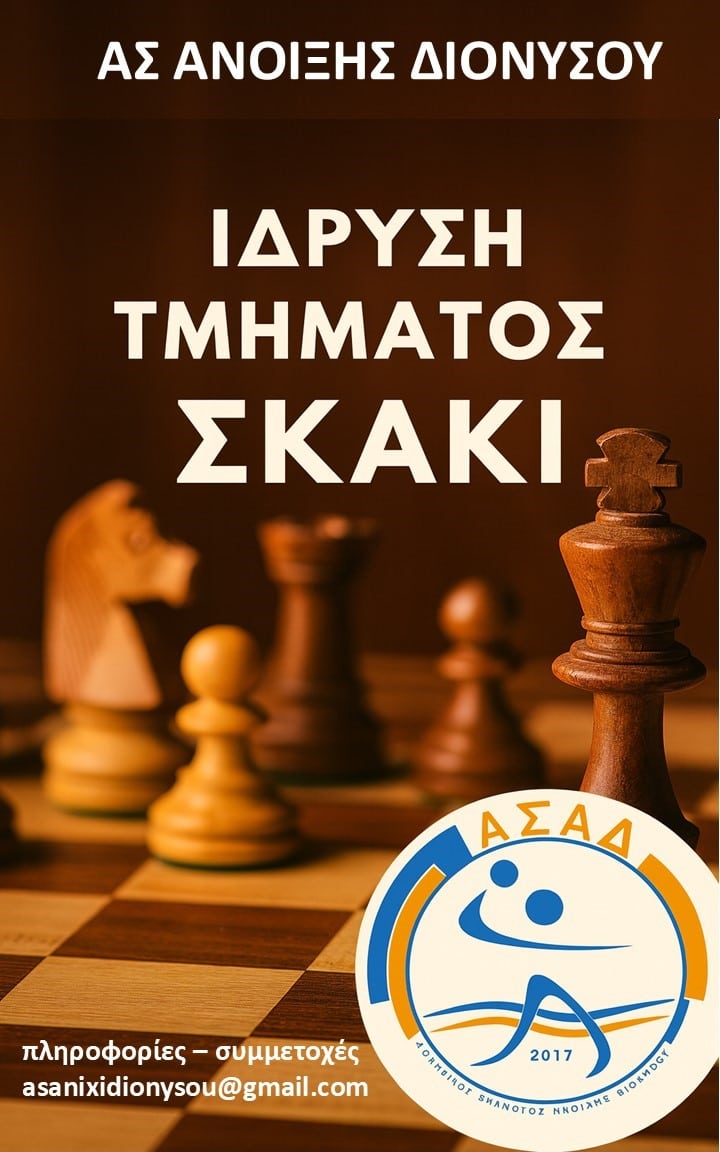 Ο ΑΣ Άνοιξης Διονύσου, στο πλαίσιο της συνεχούς ανάπτυξης και ενίσχυσης νέων αθλητικών δραστηριοτήτων στην περιοχή, ανακοινώνει την ίδρυση του νέου Τμήματος Σκακιού.