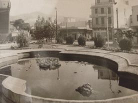 Η λίμνη κάτω από τον σταθμό του ηλεκτρικού στη νότια πλευρά το 1960. Διακρίνεται στο βάθος το ξενοδοχείο «ΝΕΟΝ» και το ζαχαροπλαστείο του Συμεωνίδη.