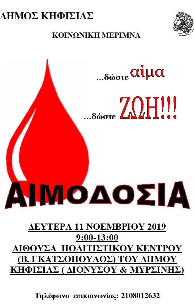 Ο Δήμος Κηφισιάς οργανώνει αιμοδοσία την Δευτέρα 11 Νοεμβρίου 2019 από τις 9 το πρωί έως τη μια το μεσημέρι στην Αίθουσα Πολιτιστικού Κέντρου Β. Γκατσόπουλος, στο ισόγειο του Δημαρχείου Κηφισιάς (Διονύσου και Μυρσίνης, τηλέφωνο επικοινωνίας 210 8012632).