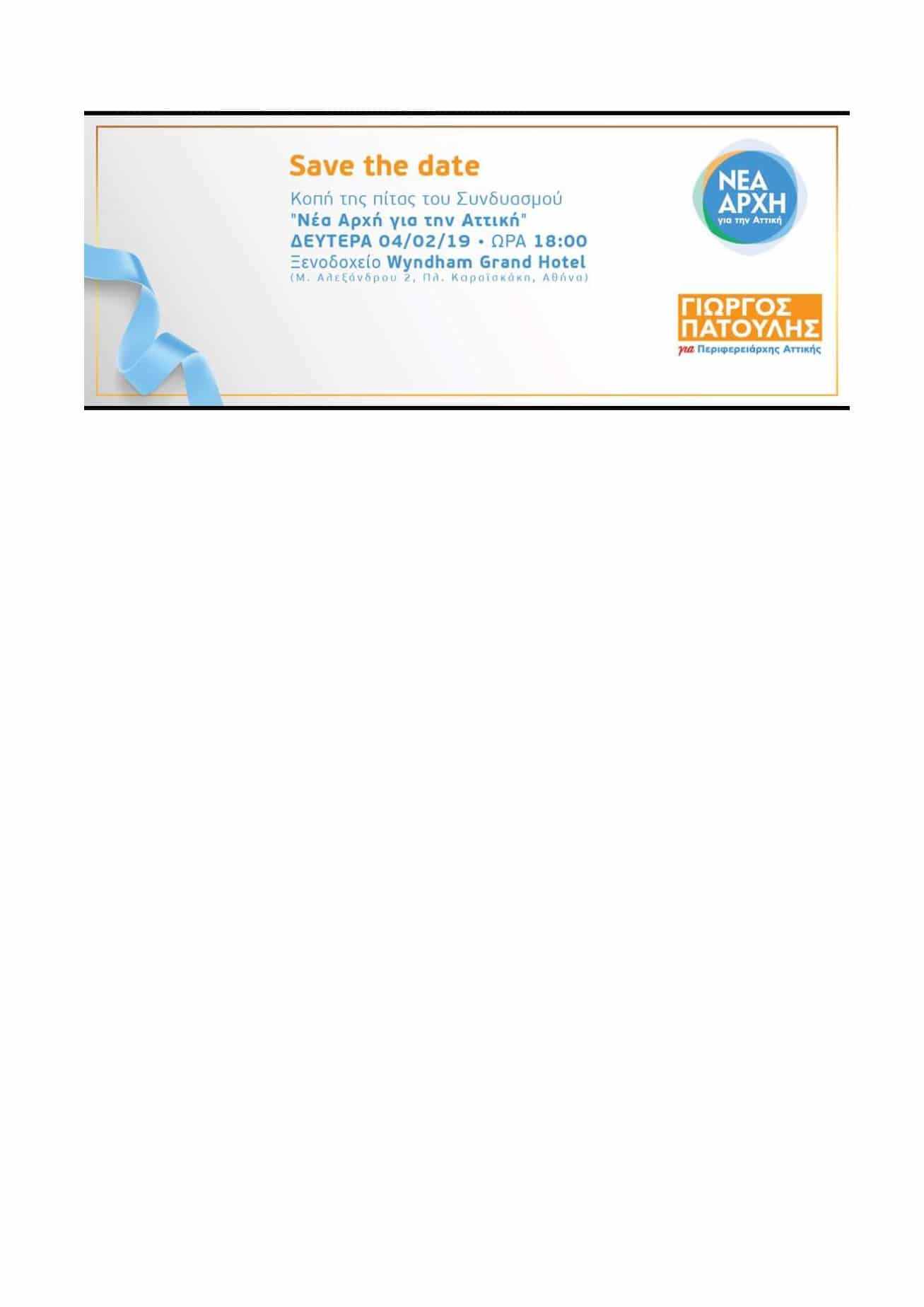 Ο υποψήφιος περιφερειάρχης και δήμαρχος Αμαρουσίου κος Γ. Πατούλης καλεί τον κόσμο, τη Δευτέρα 4 Φεβρουαρίου να παρευρεθεί στην εκδήλωση κοπής της πίτας του Συνδυασμού και να δώσει δύναμη στην προσπάθειά του.