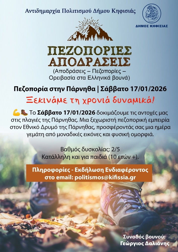 Οι πεζοπορίες και αποδράσεις που σχεδίασε και ενέταξε η Αντιδημαρχία Πολιτισμού του Δήμου Κηφισιάς στο πρόγραμμα Μαθημάτων Καλλιτεχνικής Παιδείας για ενήλικες και παιδιά 2025 – 2026 συνεχίζονται δυναμικά και τη νέα χρονιά!