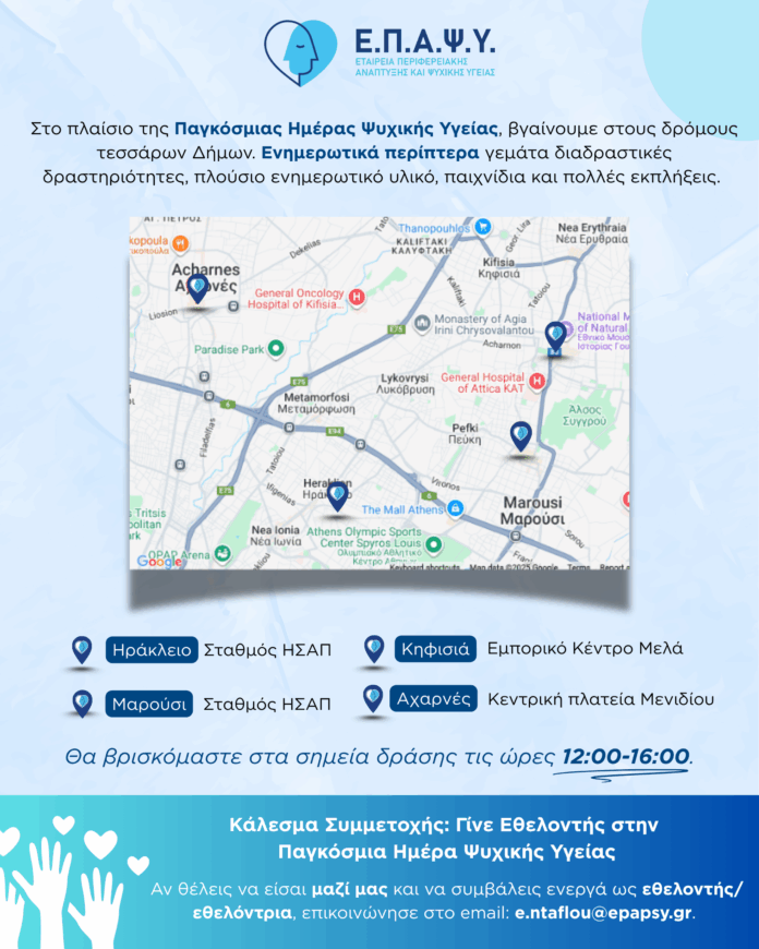 Στο πλαίσιο της Παγκόσμιας Ημέρας Ψυχικής Υγείας (10/10) η  Εταιρεία Περιφερειακής Ανάπτυξης και Ψυχικής Υγείας (Ε.Π.Α.Ψ.Υ.) σας προσκαλεί να συμμετάσχετε σε μία ακόμη μοναδική δράση στο κέντρο της Κηφισιάς, με στόχο την ενημέρωση, την ευαισθητοποίηση και την αποδόμηση των στερεοτύπων που περιβάλλουν την ψυχική υγεία.