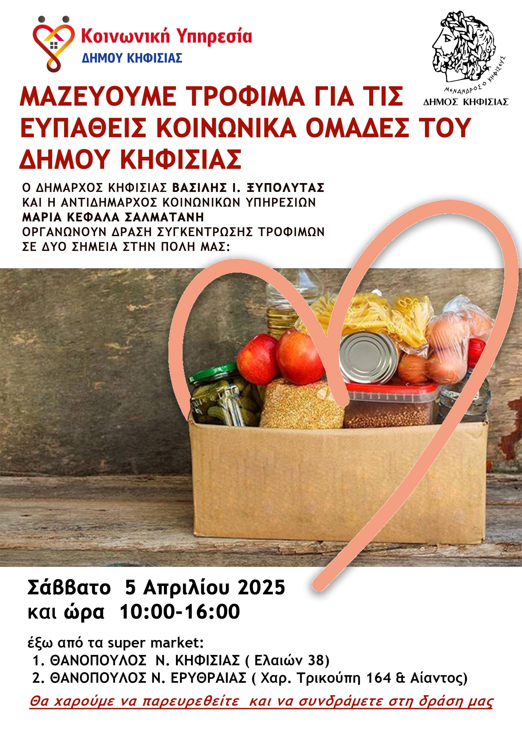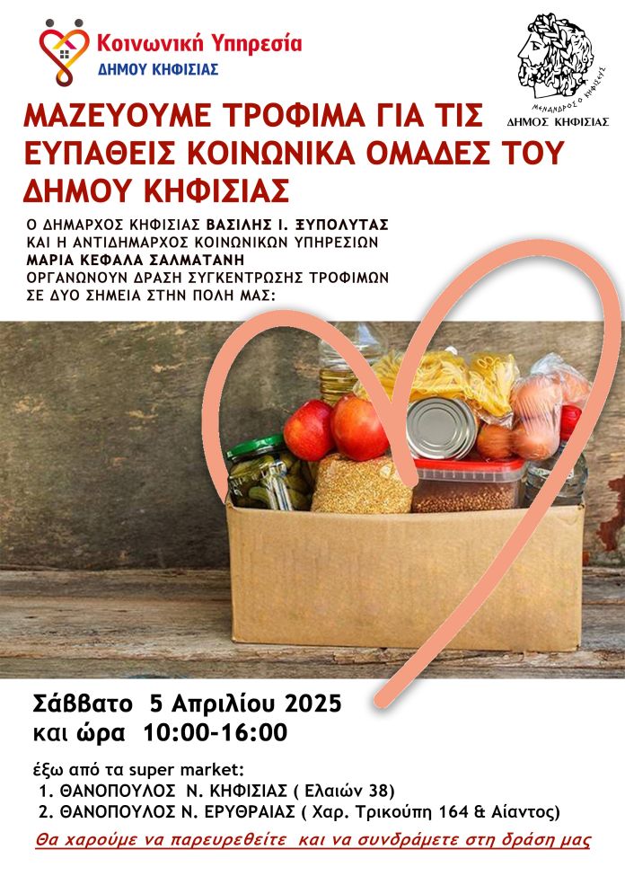 Ο Δήμαρχος Κηφισιάς, Βασίλης Ι. Ξυπολυτάς και η Αντιδήμαρχος Κοινωνικών Υπηρεσιών του Δήμου Κηφισιάς, Μαρία Κεφαλά – Σαλματάνη διοργανώνουν Δράση Συγκέντρωσης Τροφίμων, για την ενίσχυση ευάλωτων οικογενειών & πολιτών του Δήμου μας.