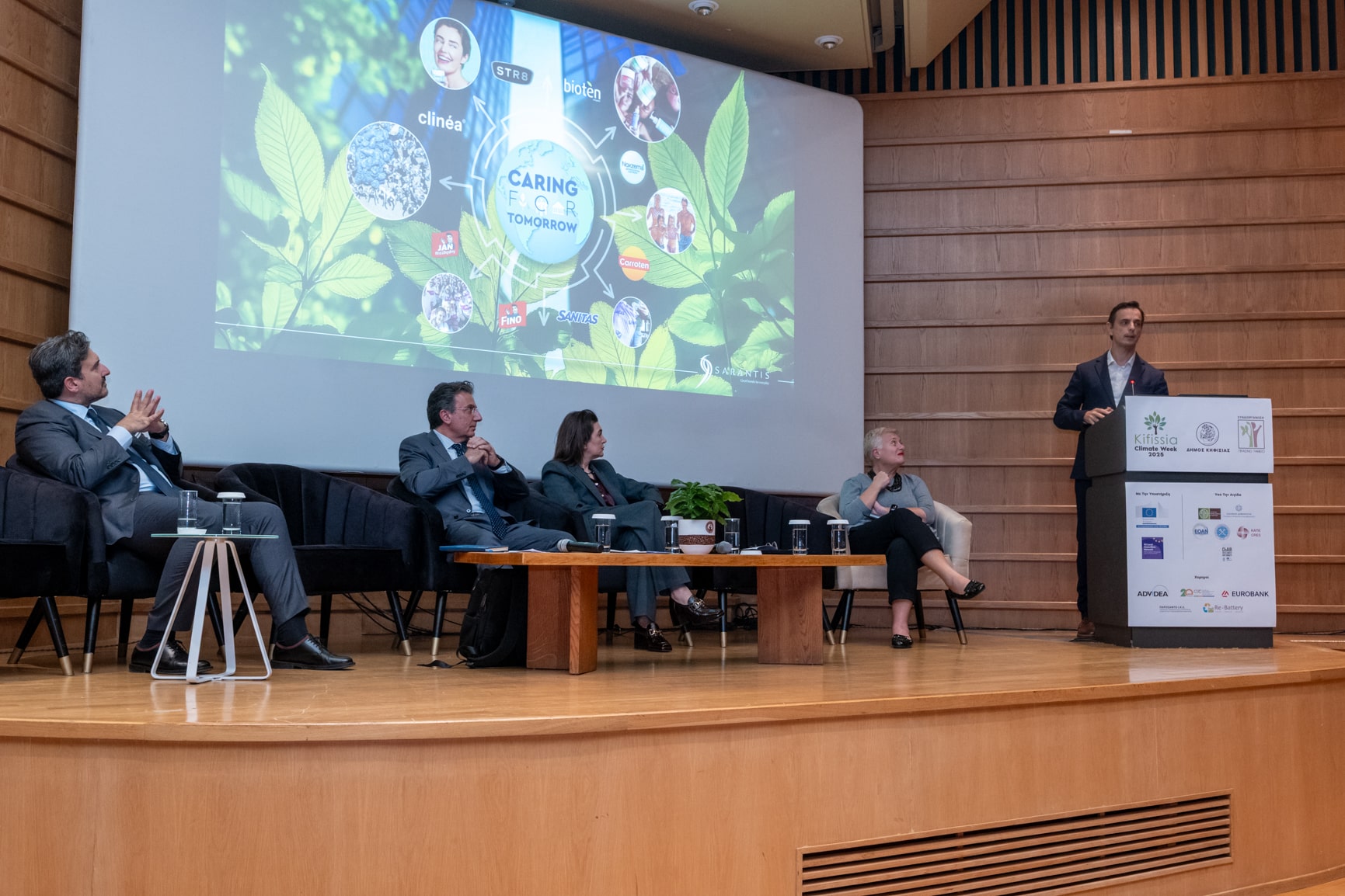 Ο κ. Τζωρτζίνης μιλώντας για τον Όμιλο Σαράντης, τόνισε πως εφαρμόζει ολοκληρωμένη στρατηγική ESG. Έχει θεσπίσει επιτροπή εταιρικής διακυβέρνησης για θέματα βιωσιμότητας και στοχεύει σε μηδενικές εκπομπές έως το 2050. Επενδύει σε πράσινη ενέργεια, φωτοβολταϊκά και χρήση 100% ανακυκλωμένων υλικών. Παράλληλα, αναπτύσσει συσκευασίες refill και κυκλικής οικονομίας, επιδιώκοντας μείωση του αποτυπώματος CO₂ στα τελικά προϊόντα και συνεργασία με την τοπική αυτοδιοίκηση για δράσεις κλιματικής ανθεκτικότητας.