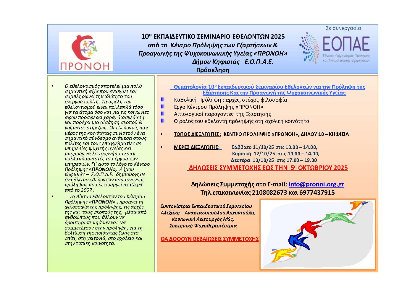 Θεματολογία 10ου Εκπαιδευτικού Σεμιναρίου Εθελοντών για την Πρόληψη της Εξάρτησης και την Προαγωγή της Ψυχοκοινωνικής Υγείας