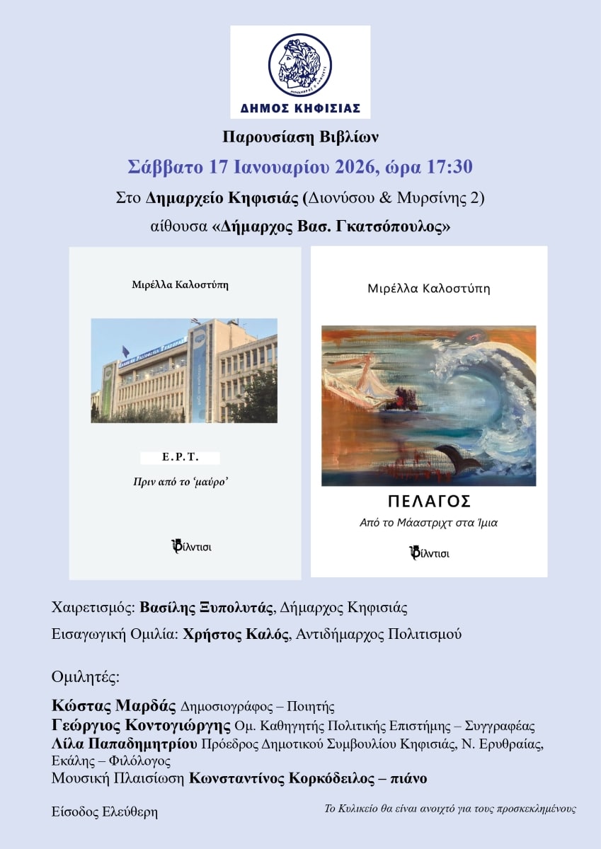 και «ΕΡΤ – Πριν από το “μαύρο”» που θα πραγματοποιηθεί το Σάββατο 17 Ιανουαρίου 2026, Ώρα 17:30 στην Αίθουσα «Δήμαρχος Βασ. Γκατσόπουλος» του Δημαρχείου Κηφισιάς (Διονύσου & Μυρσίνης 2).