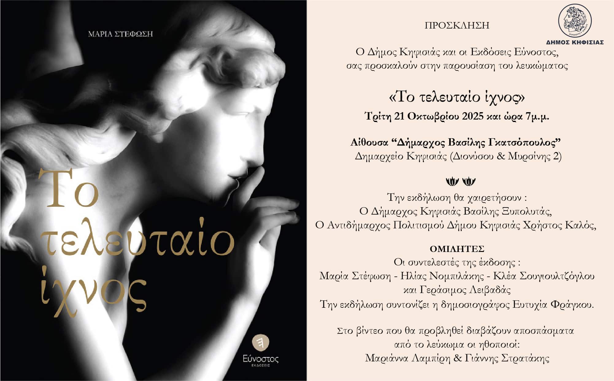 Ο Δήμος Κηφισιάς και οι Εκδόσεις Εύνοστος σας προσκαλούν στην παρουσίαση του λευκώματος «Το τελευταίο ίχνος» την Τρίτη 21 Οκτωβρίου 2025 και ώρα 7μ.μ. στην Αίθουσα “Δήμαρχος Βασίλης Γκατσόπουλος” του Δημαρχείου Κηφισιάς (Διονύσου & Μυρσίνης 2).