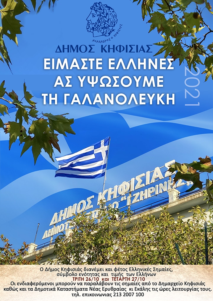 Ενόψει της εθνικής επετείου της 28ης Οκτωβρίου 1940 ο Δήμος Κηφισιάς θα προσφέρει στους πολίτες Ελληνικές σημαίες, την Τρίτη 26/10 και την Τετάρτη 27/10.