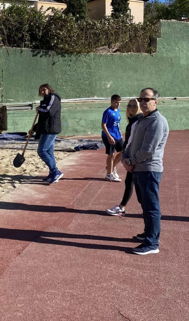 Δίπλα στα παιδιά του Δήμου μας βρισκόταν συνέχεια ο Γιώργος Πομάσκι. Με εμψυχωτικά λόγια: αλλά και με πράξεις. Ο έμπειρος προπονητής ήταν έτοιμος να προσφέρει με την απλότητα που τον διακρίνει όπου χρειαζόταν. Ο φωτογραφικός φακός αποτύπωσε την αφοσίωσή του στο αγώνισμα όταν με δική του πρωτοβουλία διόρθωσε την άμμο στο σκάμμα για να μπορέσουν τα παιδιά να κάνουν τα άλματά τους υπό τις καλύτερες συνθήκες. Ο προπονητής των επιτυχιών δεν παρέλειψε να επισημάνει στα παιδιά ότι δεν θα πρέπει να ξεχνούν και τα μαθήματά τους για να μπορέσουν να ανταποκριθούν στις ανάγκες του αύριο.