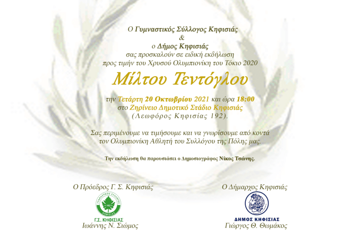 Ο Γυμναστικός Σύλλογος Κηφισιάς και ο Δήμος Κηφισιάς σας προσκαλούν στην εκδήλωση προς τιμήν του Χρυσού Ολυμπιονίκη του Τόκιο, Μίλτου Τεντόγλου.