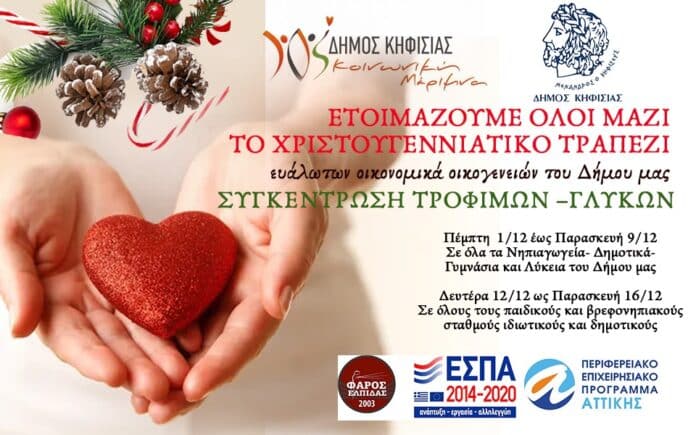 Το χριστουγεννιάτικο τραπέζι ευάλωτων οικονομικά οικογενειών του Δήμου Κηφισιάς, φέτος θα το ετοιμάσουμε όλοι μαζί. Ενώνουμε τις δυνάμεις μας μικροί και μεγάλοι προκειμένου να είναι πιο πλούσιο από ποτέ. Συγκεντρώνουμε τρόφιμα και γλυκά στα σχολεία και παιδικούς σταθμούς του Δήμου μας αποδεικνύοντας εμπράκτως τη στήριξής μας και την αγάπη μας.