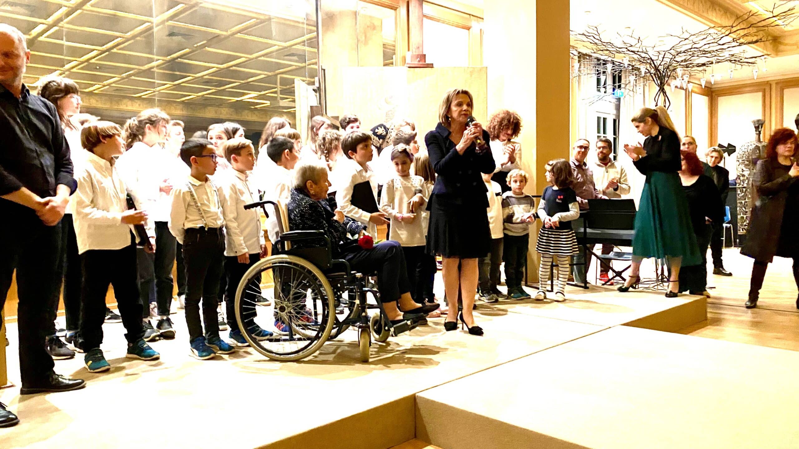 Ωστόσο, η πιο συγκινητική στιγμή της βραδιάς που έκαναν τα μάτια της Ελένης Αρβελέρ να πλημμυρήσουν από διάφανα υγρά διαμαντάκια, ήταν όταν η Βασιλική Καρακώστα, μέλος του Δ.Σ. του Συλλόγου και γνωστή ερμηνεύτρια παραδοσιακών μελωδιών, αφού ερμήνευσε μικρασιάτικα ακούσματα, κάλεσε στη σκηνή την Παιδική Χορωδία του Δήμου Κηφισιάς. Οι λιλιπούτειοι μελωδοί με τη διεύθυνση του μαέστρου Θανάση Αρβανίτη πλαισίωσαν την 96χρονη “έφηβη” για να της τραγουδήσουν αγαπημένες της μελωδίες από την αξέχαστη πατρίδα, προσφέροντάς της ένα κόκκινο τριαντάφυλλο.