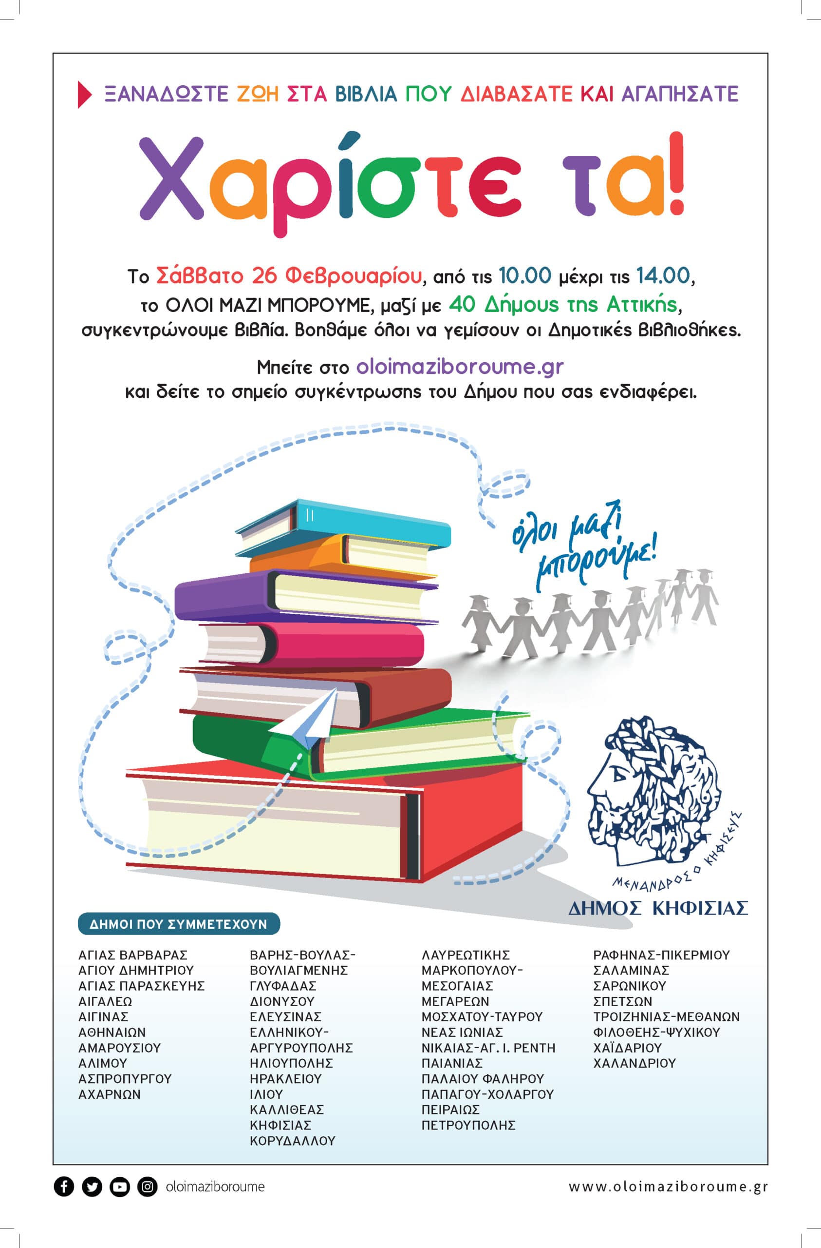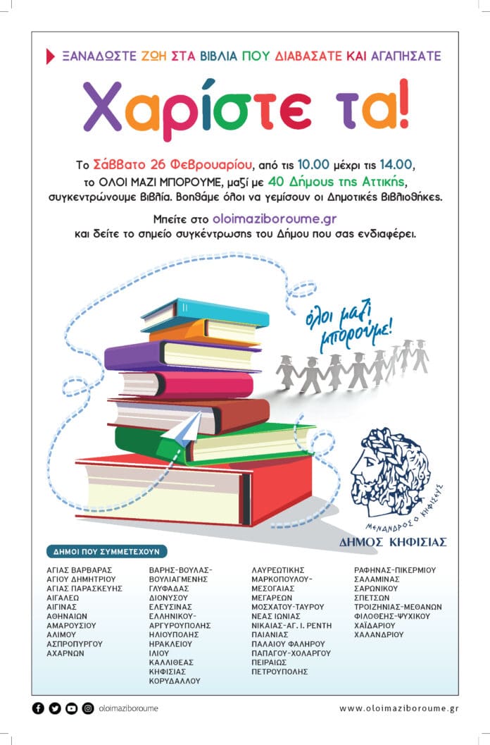 Ο Δήμος Κηφισιάς, συμμετέχοντας στην κοινωνική δράση του «ΟΛΟΙ ΜΑΖΙ ΜΠΟΡΟΥΜΕ», μαζί με 40 Δήμους της Αττικής, συγκεντρώνει λογοτεχνικά βιβλία προκειμένου να ενισχυθούν δημοτικές βιβλιοθήκες που λειτουργούν στον Δήμο μας.