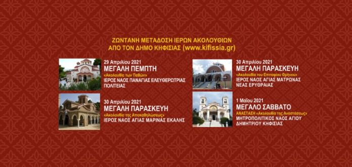 Η απευθείας μετάδοση των Ιερών Ακολουθιών θα γίνει μέσω του portal του Δήμου Κηφισιάς (www.kifissia.gr) σύμφωνα με το παρακάτω πρόγραμμα: