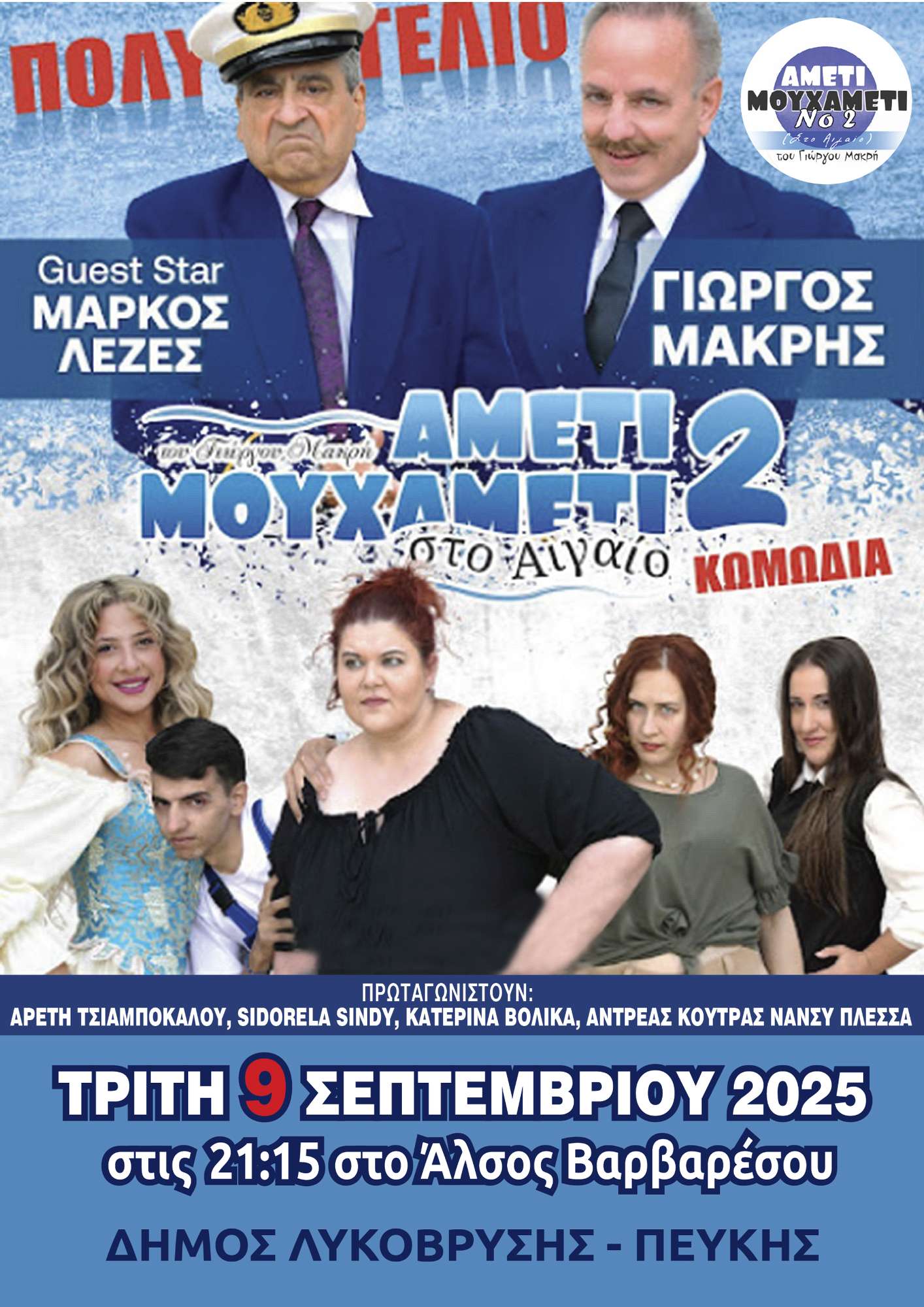 Ο Πολιτιστικός Σεπτέμβρης στον Δήμο Λυκόβρυσης-Πεύκης κάνει «πρεμιέρα» για το 2025 με την αγαπημένη κωμωδία «Αμέτι Μουχαμέτι στο Αιγαίο 2». Την θεατρική παράσταση θα παρουσιάσει την Τρίτη 9 Σεπτεμβρίου στις 21:15 στο Άλσος Βαρβαρέσου ο Γιώργος Μακρής.