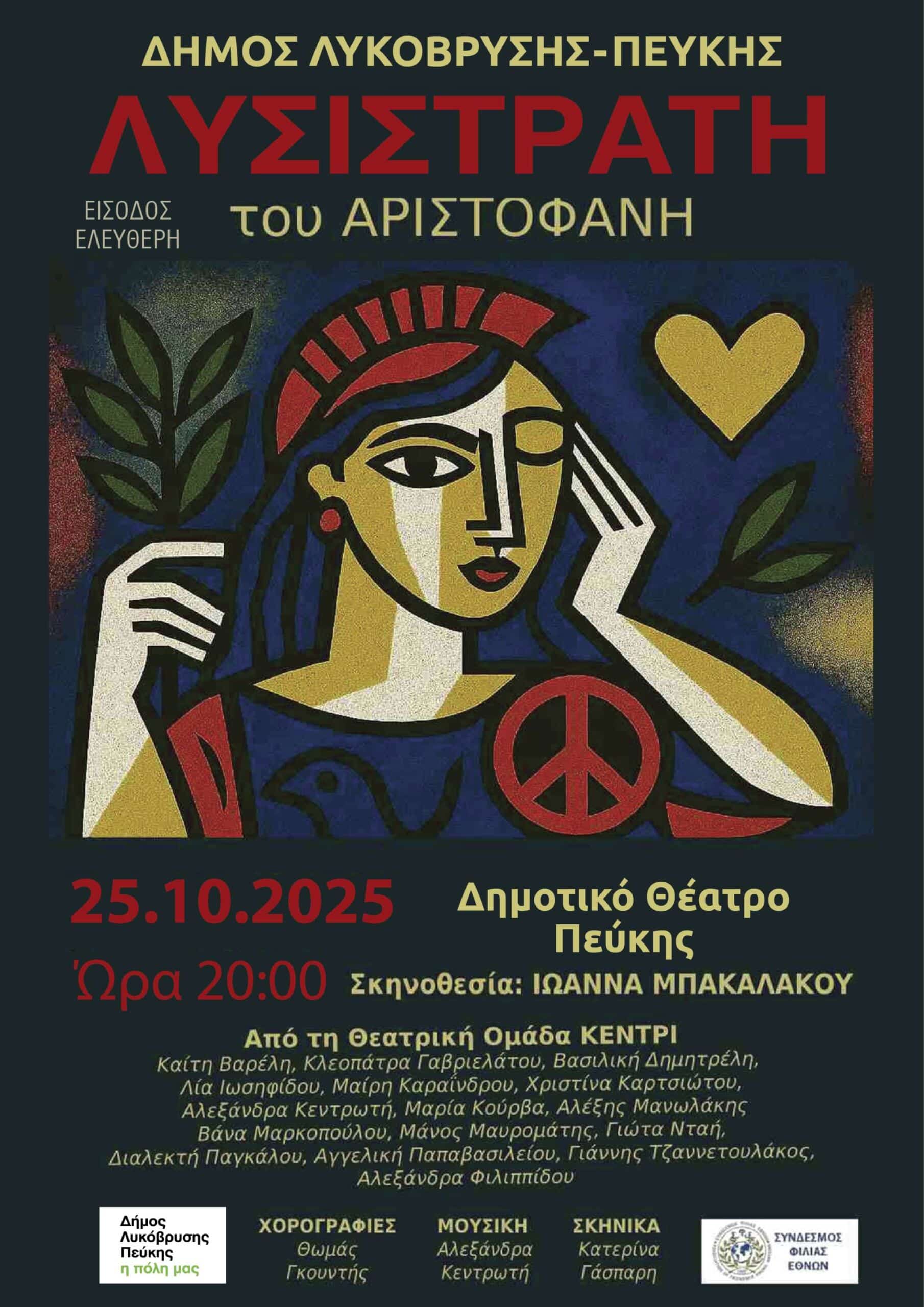 Ο Δήμος Λυκόβρυσης-Πεύκης σε συνεργασία με τον Σύνδεσμο Φιλίας Εθνών, σάς προσκαλούν το Σάββατο 25 Οκτωβρίου 2025 & ώρα 20:00, στο Δημοτικό Θέατρο Πεύκης να παρακολουθήσετε την θεατρική κωμωδία «Λυσιστράτη» του Αριστοφάνη από τη θεατρική ομάδα «Κεντρί», σε σκηνοθεσία και προσαρμογή της Ιωάννας Μπακαλάκου.