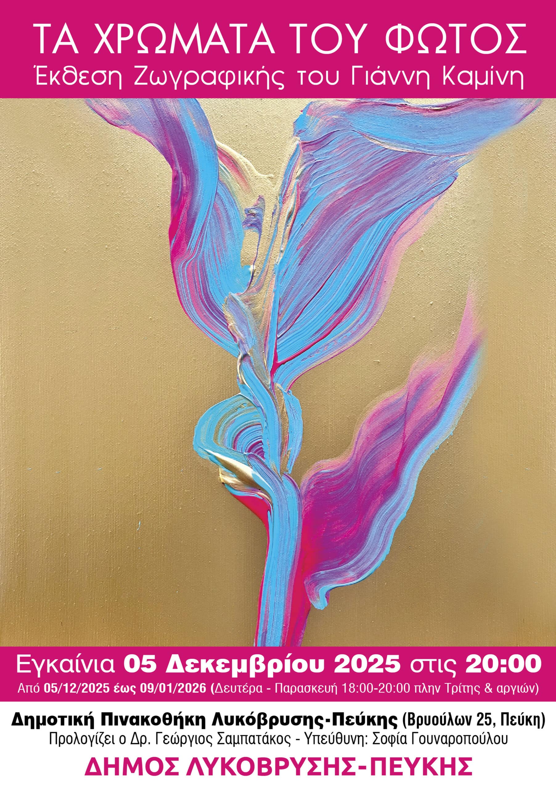 Η νέα του έκθεση, με τίτλο «Τα Χρώματα του Φωτός», αποτελεί μια βαθιά καλλιτεχνική προσέγγιση στη σχέση του ανθρώπου με το εσωτερικό του φως. Ο καλλιτέχνης αναδεικνύει την πορεία της ψυχής μέσα από τις δυσκολίες, σαν μια φυσική δύναμη που, παρά τους περιορισμούς, βρίσκει τρόπο να ανέρχεται, να ανθίζει και να επαναπροσδιορίζεται. Με συμβολισμούς, αρχετυπικές αναφορές και διαχρονικές έννοιες, ο Γιάννης Καμίνης προτείνει μια σύγχρονη ανάγνωση της αφηρημένης τέχνης, γεμάτη αρμονία και καλαισθησία.