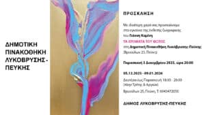 Η Δημοτική Πινακοθήκη Λυκόβρυσης-Πεύκης ανοίγει τις πόρτες της και υποδέχεται με ιδιαίτερη χαρά την έκθεση ζωγραφικής του διεθνούς φήμης εικαστικού Γιάννη Καμίνη. Η έκθεση παρουσιάζεται στο πλήρως ανακαινισμένο κτίριο, δωρεά της εκπαιδευτικού Μαίρης Τζερμιά, το οποίο δεσπόζει σε έναν προσεγμένο κήπο 3,5 στρεμμάτων, προσφέροντας ένα περιβάλλον γαλήνης και έμπνευσης που αναδεικνύει ιδανικά το έργο του καλλιτέχνη.