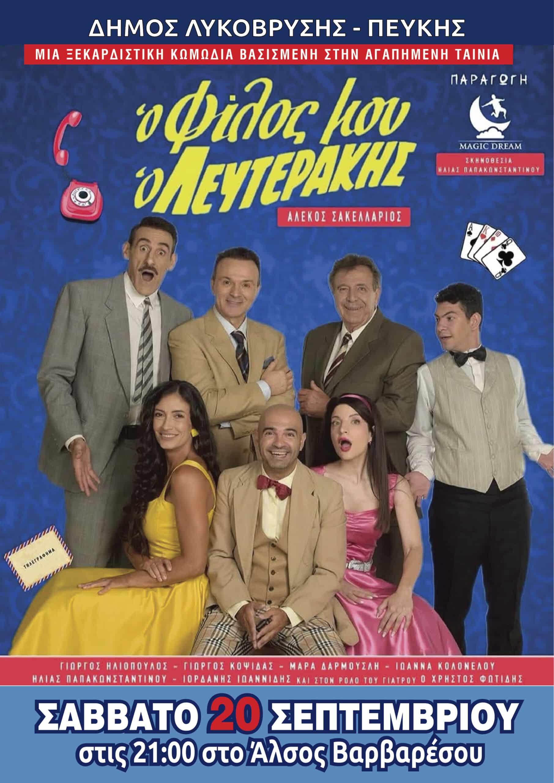 Η ξεκαρδιστική κωμωδία, βασισμένη στην αγαπημένη ταινία του Αλέκου Σακελλαρίου «Ο φίλος μου ο Λευτεράκης» έρχεται στο Δήμο Λυκόβρυσης – Πεύκης, το ερχόμενο Σάββατο 20 Σεπτεμβρίου στις 21:00, στο Άλσος Βαρβαρέσου.