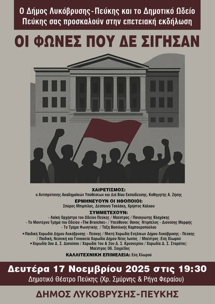 Τη Δευτέρα, 17 Νοεμβρίου 2025 και ώρα 19:30, ο Δήμος Λυκόβρυσης – Πεύκης και το Δημοτικό Ωδείο Πεύκης διοργανώνουν στο Δημοτικό Θέατρο Πεύκης (Χρυσοστόμου Σμύρνης & Ρήγα Φεραίου) την επετειακή εκδήλωση «Οι φωνές που δεν σίγησαν», αφιερωμένη στην Εξέγερση του Πολυτεχνείου και στους αγώνες για ελευθερία και δημοκρατία.