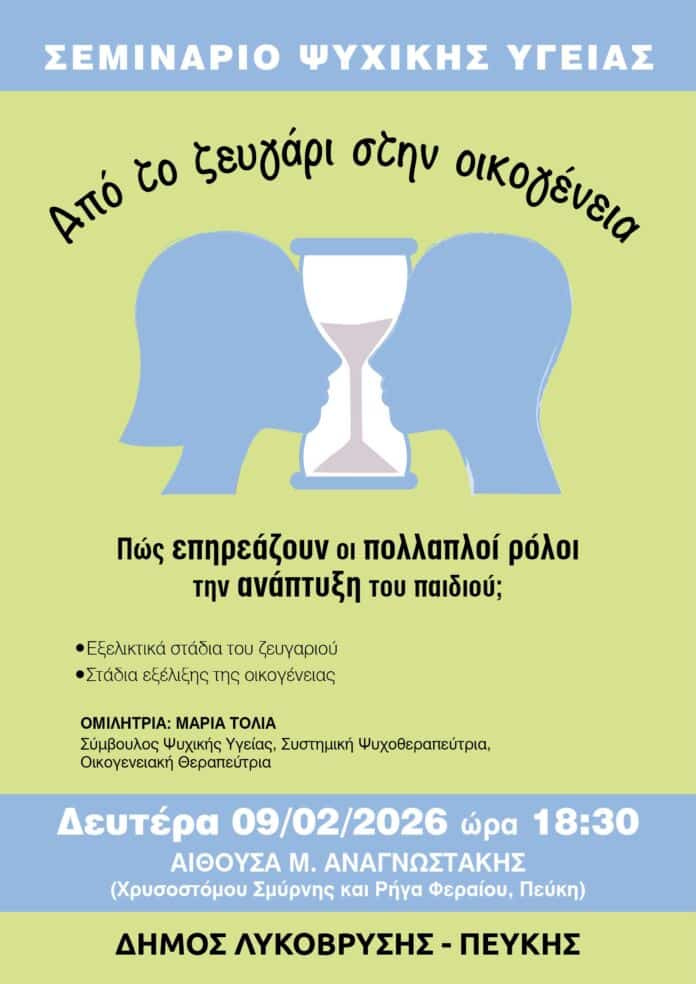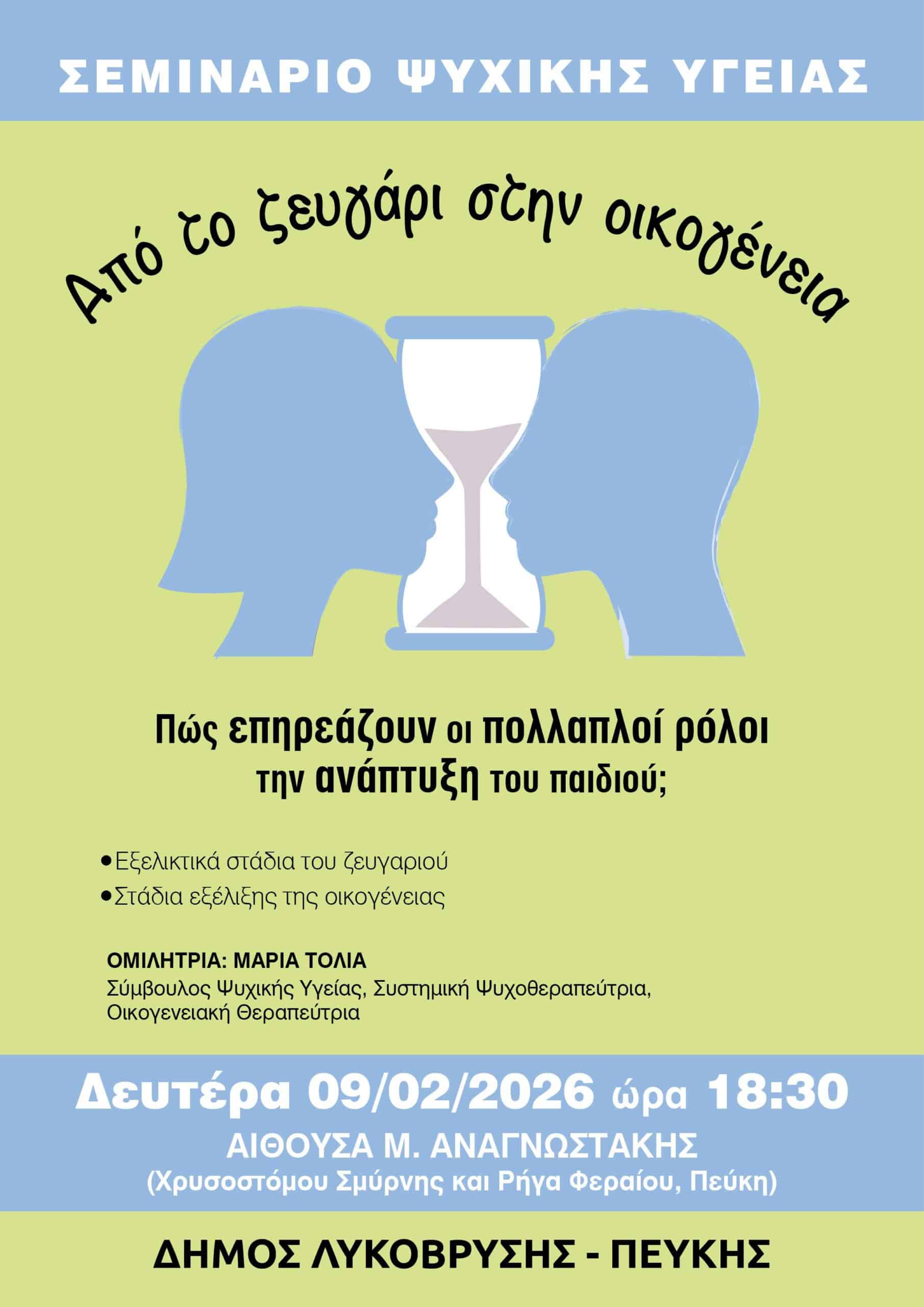 Ο Δήμος Λυκόβρυσης-Πεύκης συνεχίζει τη σειρά σεμιναρίων Ψυχικής Υγείας, με ομιλήτρια την Μαρία Τόλια, Σύμβουλο Ψυχικής Υγείας, Συστημική Ψυχοθεραπεύτρια, Οικογενειακή Θεραπεύτρια, η οποία θα παρουσιάσει το δεύτερο σεμινάριο, τη Δευτέρα 9 Φεβρουαρίου 2026 και ώρα 18:30, στην Αίθουσα Μ. Αναγνωστάκης (Χρυσοστόμου Σμύρνης και Ρήγα Φεραίου, Πεύκη).