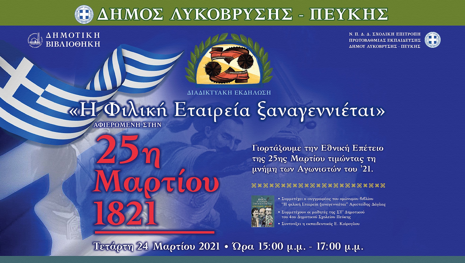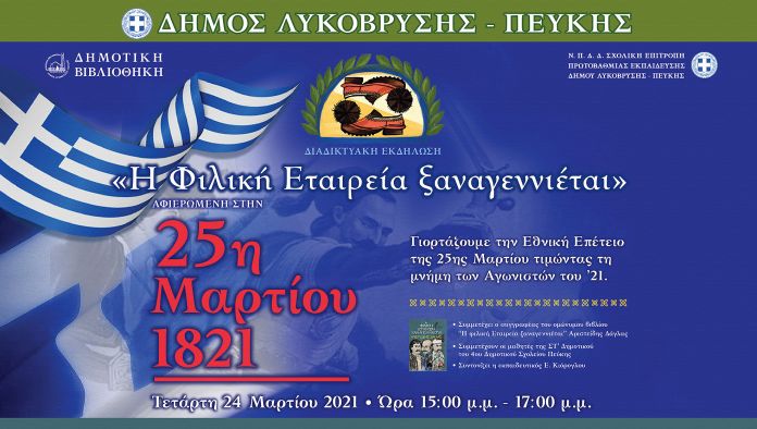 Την Τετάρτη 24 Μαρτίου 2021, παραμονή της εθνικής επετείου, από τις 3 ως τις 5 μ.μ. Ο Δήμος σε συνεργασία με την Πρωτοβάθμια Σχολική Επιτροπή και με το ΚΟΙΠΑΠ (Δημοτική Βιβλιοθήκη) προσκαλούν τους πολίτες σε διαδικτυακή εκδήλωση που θα προβληθεί από τη σελίδα του Δήμου Λυκόβρυσης- Πεύκης στο facebook για την 25η Μαρτίου με τίτλο: ‘’Η φιλική εταιρία ξαναγεννιέται’’. Στην εκδήλωση θα συμμετέχουν ο συγγραφέας του ομώνυμου βιβλίου κος Αριστείδης Δάγλας, η εκπαιδευτικός του 4ου δημοτικού σχολείου Πεύκης κυρία Ελένη Κιόρογλου και μαθητές της έκτης τάξης του 4ου δημοτικού σχολείου Πεύκης. Θα πραγματοποιηθεί διαδραστικό παιχνίδι ερωτήσεων μεταξύ μαθητών και του συγγραφέα αναδεικνύοντας την αναγκαιότητα της ομαδικότητας για την εκπλήρωση των στόχων.