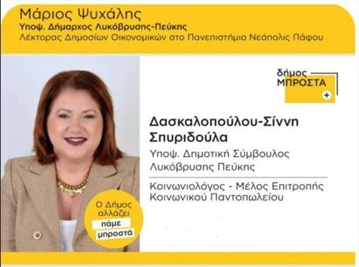 *Η Σπυριδούλα Σίννη-Δασκαλοπούλου είναι Μέλος επιτροπής κοινωνικού παντοπωλείου Δήμου Λυκόβρυσης Πεύκης και υποψήφια δημοτική σύμβουλος Λυκόβρυσης