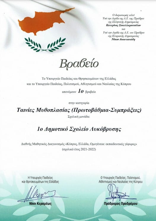 Το πρώτο βραβείο απέσπασε η συμμετοχή του 1ου Δημοτικού Σχολείου Λυκόβρυσης στον 8ο Διεθνή Διαγωνισμό “Κύπρος – Ελλάδα -Ομογένεια: Εκπαιδευτικές Γέφυρες” για το έτος 2021-2022.