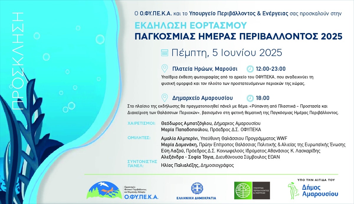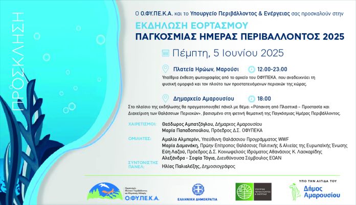 Με την ευκαιρία του εορτασμού της Παγκόσμιας Ημέρας Περιβάλλοντος 2025, με κεντρικό σύνθημα «Ας νικήσουμε την πλαστική ρύπανση» (BeatPlasticPollution),ο Οργανισμός Φυσικού Περιβάλλοντος & Κλιματικής Αλλαγής (Ο.ΦΥ.ΠΕ.ΚΑ.), σε συνεργασία το Υπουργείο Περιβάλλοντος & Ενέργειας και με την υποστήριξη του Δήμου Αμαρουσίου, διοργανώνει κεντρική εκδήλωση στο Μαρούσι, την Πέμπτη 5 Ιουνίου 2025 που περιλαμβάνει: