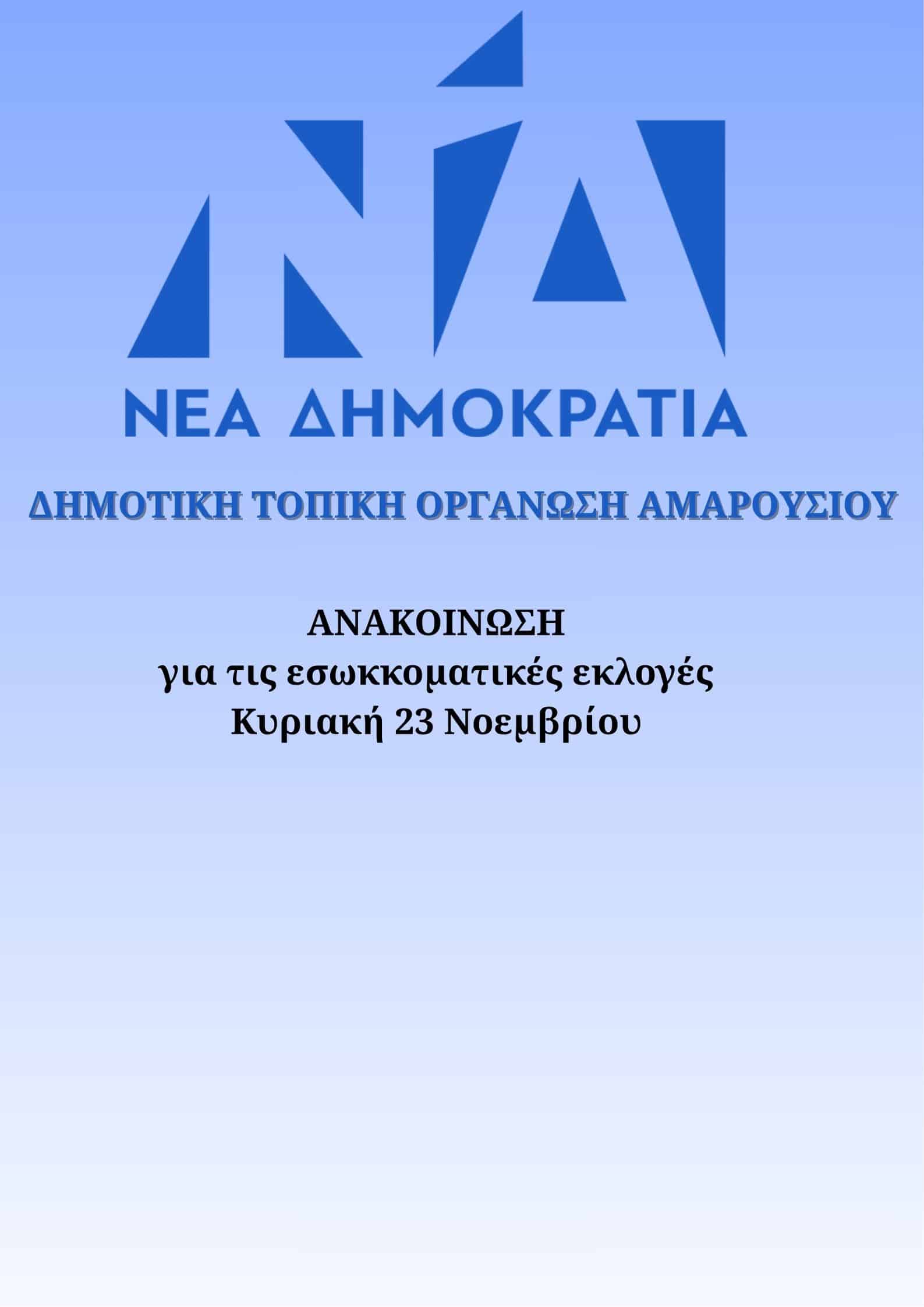 Η Δημοτική Τοπική Οργάνωση Ν.Δ. Αμαρουσίου ενημερώνει τα Μέλη και τους Φίλους του Κόμματος μας ότι, στις 23 Νοεμβρίου 2025 ημέρα Κυριακή θα πραγματοποιηθούν εσωκκοματικές εκλογές για την ανάδείξη, Προέδρων και Μέλων των ΔΕΕΠ, Προέδρων και Μελών των ΔΗΜ.Τ.Ο. καθώς και την εκλογή Συνέδρων.