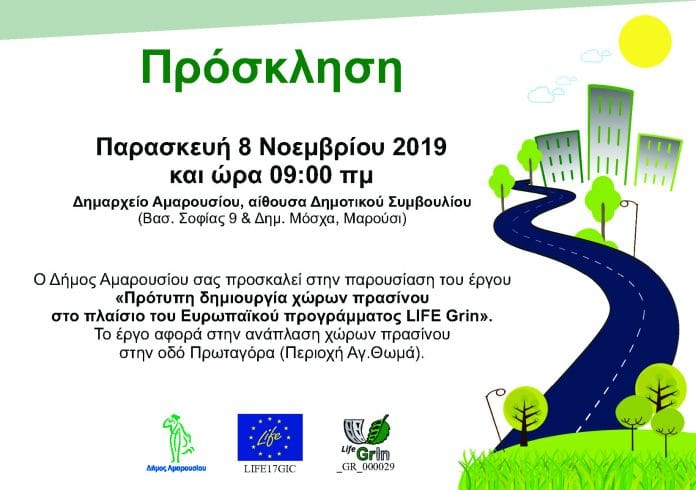 Ενημερωτική ημερίδα για την παρουσίαση του έργου «Πρότυπη δημιουργία χώρων πρασίνου, στο πλαίσιο του Ευρωπαϊκού προγράμματος LIFE Grin» διοργανώνει ο Δήμος Αμαρουσίου, την Παρασκευή 8 Νοεμβρίου 2019 και ώρα 09:00 π.μ., στο Δημαρχείο Αμαρουσίου (Βασ. Σοφίας 9 & Δ. Μόσχα).