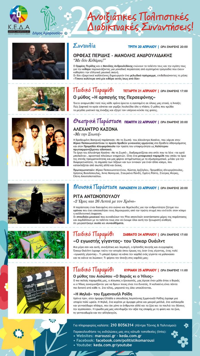 Με τις οδηγίες του Δημάρχου Αμαρουσίου Θεόδωρου Αμπατζόγλου, και στο πλαίσιο διαδικτυακών δράσεων με ευθύνη της ΚΕΔΑ και του Προέδρου της Νίκου Πέππα,   που στοχεύουν στην ψυχαγωγία των Μαρουσιωτών, διοργανώνεται μία εβδομάδα γεμάτη μουσική, παραμύθια και θέατρο, για μικρούς και μεγάλους από την Τρίτη 20 Απριλίου μέχρι και την Κυριακή 25 Απριλίου 2021.