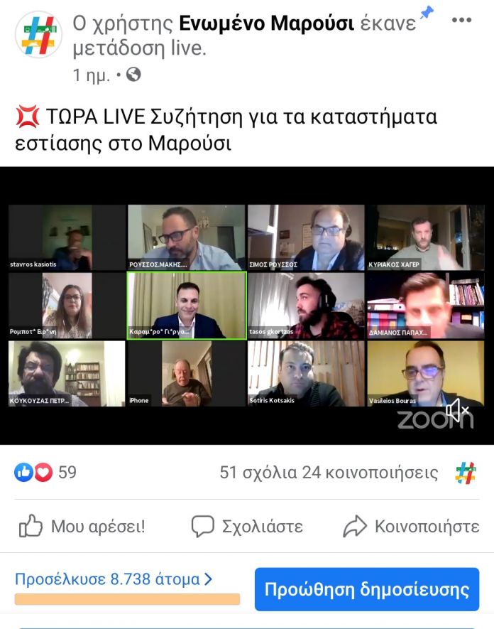 Τα προβλήματα επιβίωσης του χώρου της εστίασης και η έλλειψη έμπρακτης στήριξης από την δημοτική αρχή του Αμαρουσίου αναδείχθηκαν από την 3η διαδικτυακή εκδήλωση που διοργάνωσε η δημοτική παράταξη #Ενωμένο Μαρούσι με θέμα «Πανδημία στην Εστίαση».