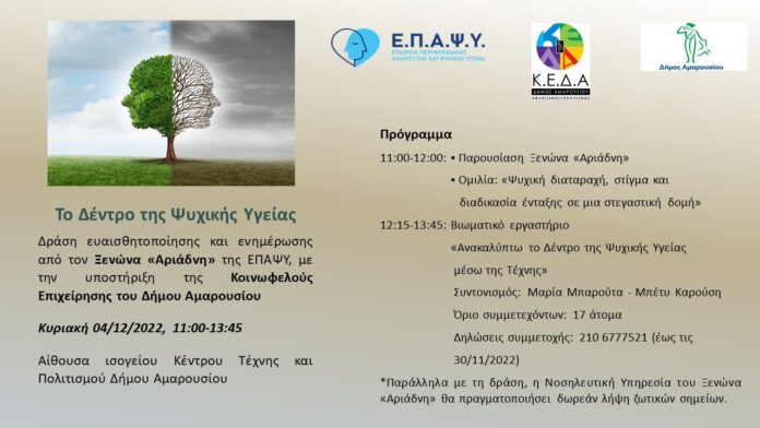 Δράση ευαισθητοποίησης & ενημέρωσης “Το Δέντρο της Ψυχικής Υγείας” από τον Ξενώνα “ΑΡΙΑΔΝΗ” της Ε.Π.ΑΨ.Υ  με την υποστήριξη της Κοινωφελους Επιχείρησης του Δήμου Αμαρουσίου την Κυριακή, 4 Δεκεμβρίου 2022,  11:00-13:45 στην αίθουσα ισογείου του Κέντρου Τέχνης και Πολιτισμού (Βασ.Σοφίας 85, Μαρούσι).