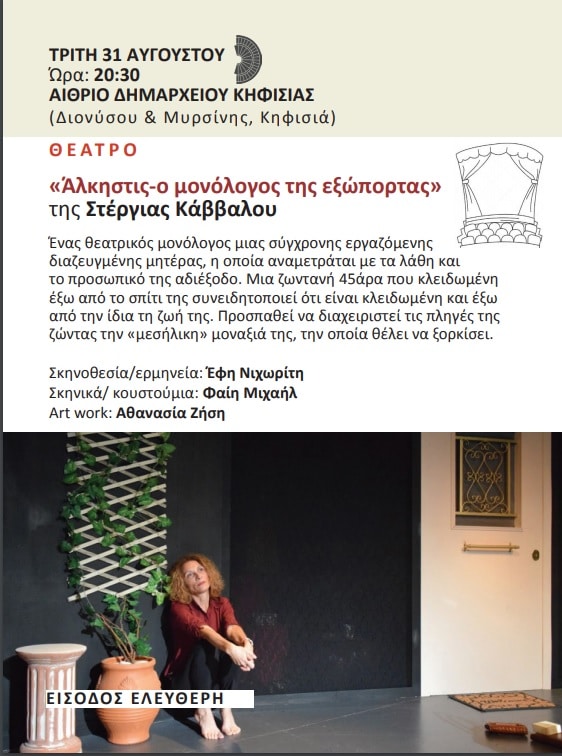 Το θεατρικό έργο της Στέργιας Κάββαλου, σε σκηνοθεσία και ερμηνεία της Έφης Νιχωρίτη παρουσιάζεται την Τρίτη 31 Αυγούστου στο πλαίσιο των εκδηλώσεων Μενάνδρεια 2021. Πρόκειται για έναν εμνευσμένο μονόλογο, ρεαλιστικό, ανθρώπινο, συναισθηματικό, σε δημιουργία και απόδοση από τις δυο πολυτάλαντες Μαρουσιώτισσες. Η παράσταση “΄Αλκηστις- Ο μονόλογος της εξώπορτας” πρόκειται να κεντρίσει το ενδιαφέρον και σίγουρα να καθηλώσει τους θεατές.
