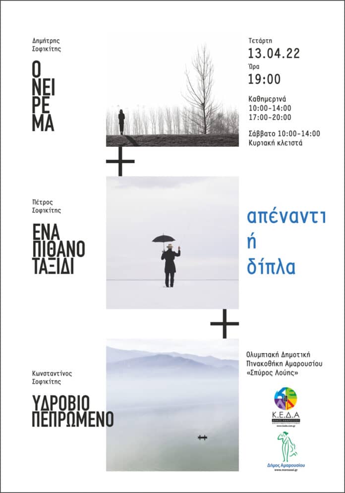 Στην έκθεση µε τίτλο «Απέναντι η Δίπλα», που θα φιλοξενηθεί στην Ολυμπιακή Δημοτική Πινακοθήκη Αμαρουσίου «Σπύρος Λούης», παρουσιάζονται τρεις φωτογραφικές ενότητες: το «Ονείρεµα» του Δηµήτρη Σοφικίτη από το 1999, το «Ένα πιθανό ταξίδι» του Πέτρου Σοφικίτη και το «Υδρόβιο πεπρωµένο» του Κωνσταντίνου Σοφικίτη από το 2018. Είναι δε η πρώτη φορά που ο Δηµήτρης Σοφικίτης και οι δύο γιοί του, συναντώνται φωτογραφικά σε έναν κοινό εκθεσιακό χώρο και επιλέγουν να μοιραστούν µε τον θεατή ένα προσωπικό ταξίδι στο χρόνο. Κοινό σηµείο αναφοράς, και στο επίκεντρο της έκθεσης, είναι ο υγροβιότοπος της Κερκίνης, ο οποίος αποτελεί για τους τρεις τους έναν τόπο πεπρωμένο, έναν τόπο που ερήµην του ενώνει τις δύο γενιές ταξιδευτών φωτογράφων. Με σκοπό να συνδιαλεχθούν µε το προσωπικό «Ονείρεµα» του πατέρα τους, ο Πέτρος και ο Κωνσταντίνος επιστρέφουν και αποτυπώνουν, μέσα από τη δική τους ματιά ο καθένας, τον μεταβλητό κόσμο του υδροβιότοπου, που μαγνήτισε το βλέμμα του Δημήτρη και αποτέλεσε τόπο μελέτης για εκείνον σχεδόν 20 χρόνια πριν.