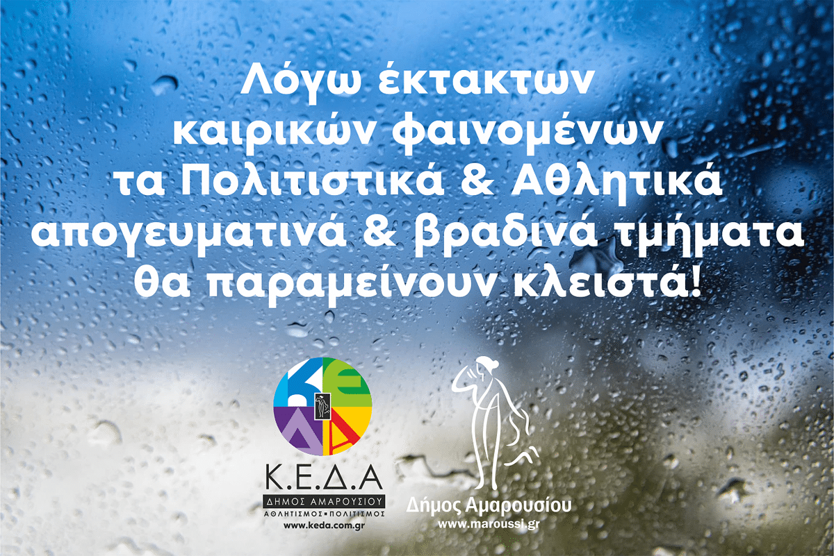 ΜΑΡΟΥΣΙ Επείγουσα ενημέρωση Από ΑΘΜΟΝΙΟΝΒΗΜΑ - 26 Ιανουαρίου 2023 0 μερίδιο FacebookTwitterPinterestWhatsApp Δε θα λειτουργήσουν σήμερα, 26 Ιανουαρίου 2023 τα αθλητικά και πολιτιστικά (απογευματινά και βραδινά) τμήματα του Δημου Αμαρουσιου.