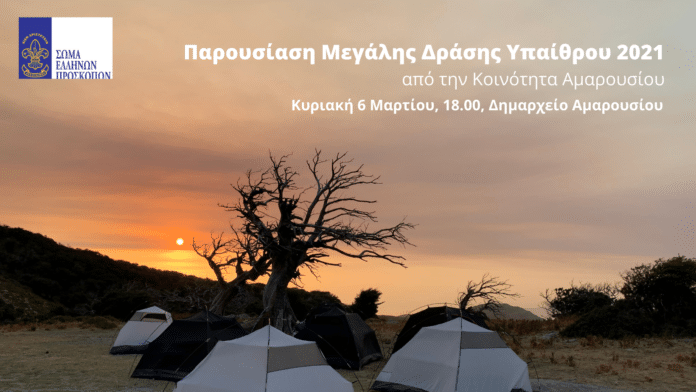 Την Κυριακή 6 Μαρτίου 2022, στις 18.00 μμ., η φιλόξενη αίθουσα του Δημαρχείου Αμαρουσίου (Βασ. Σοφίας 9 & Τ.Κ Δημητρίου Μόσχα, Μαρούσι) θα ανοίξει τις πόρτες της για να υποδεχτεί παιδιά, γονείς αλλά και φίλους του προσκοπισμού που θα παραστούν στην Παρουσίαση της Μεγάλης Δράσης Υπαίθρου 2021 της Κοινότητας Ανιχνευτών.