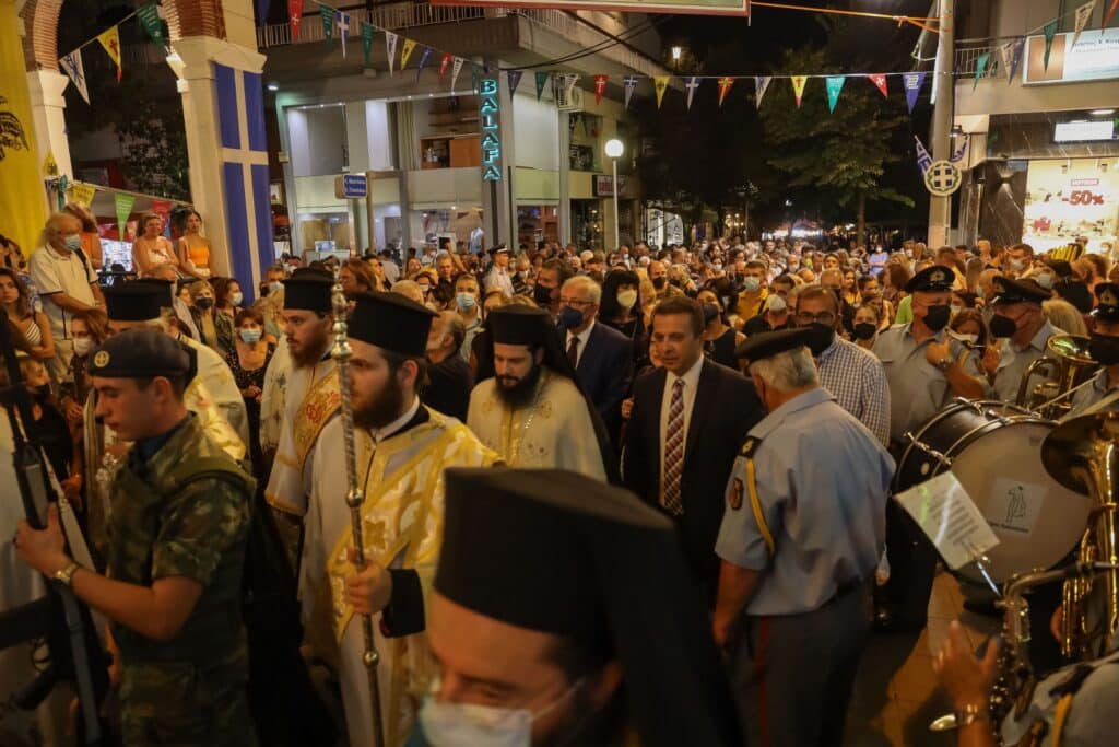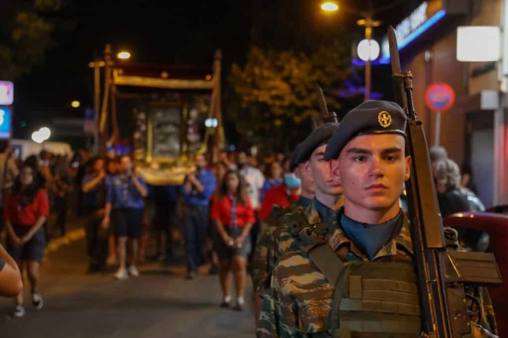 Ακολούθησε σε κατανυκτικό κλίμα η λιτάνευση της Ιερής Εικόνας της Κοιμήσεως της Θεοτόκου συνοδεία της Φιλαρμονικής Ορχήστρας του Δήμου Αμαρουσίου και του αγήματος του Στρατού, καθώς και εκπροσώπων του σώματος Ποντίων Αμαρουσίου, του σώματος Ελλήνων Προσκόπων και του σώματος Ελληνικού Οδηγισμού.