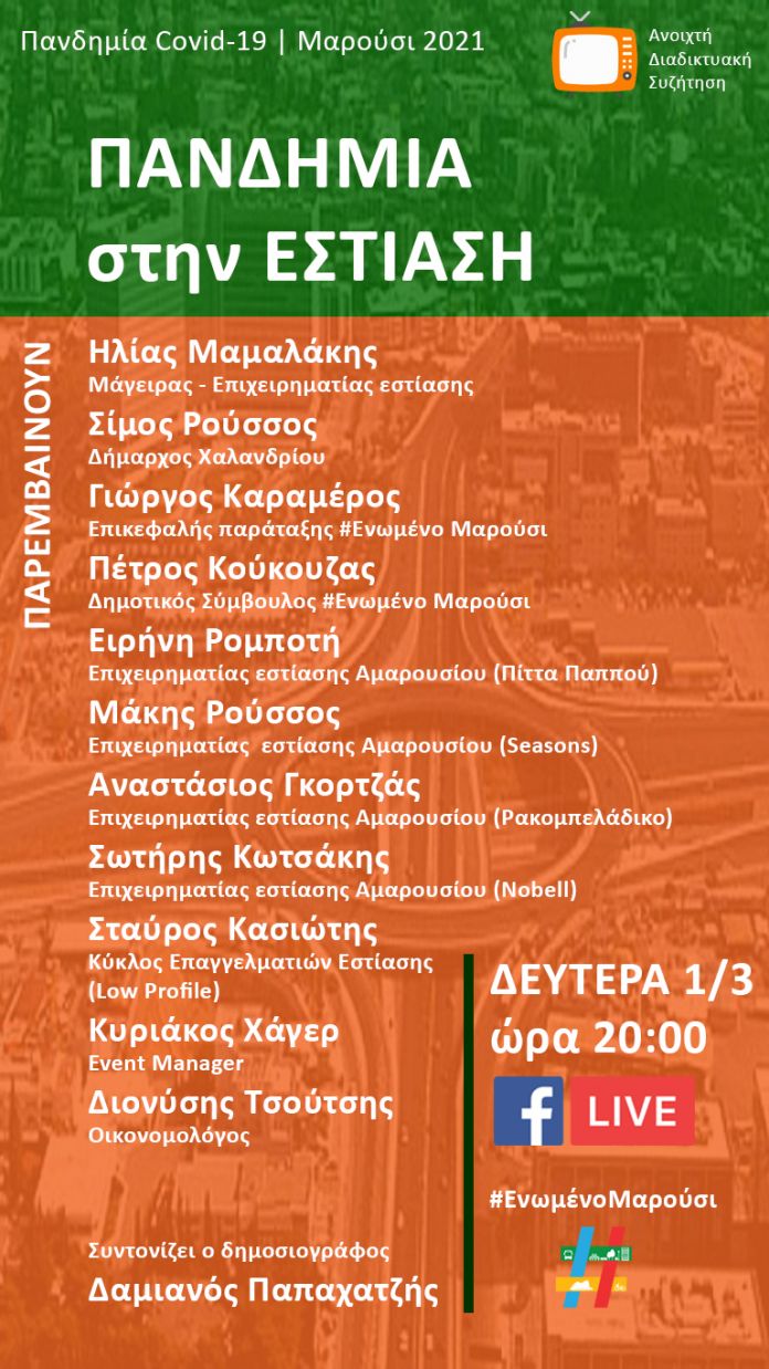 Μια ακόμη επίκαιρη και ενδιαφέρουσα διαδικτυακή συζήτηση διοργανώνει η δημοτική παράταξη #Ενωμένο Μαρούσι την Δευτέρα 1η Μαρτίου και ώρα 20:00. Η εκδήλωση που θα μεταδοθεί από την σελίδα της παράταξης στο Facebook θα ασχοληθεί με το σημαντικό θέμα «Πανδημία στην Εστίαση» αναφορικά με τις επιπτώσεις στο Μαρούσι αλλά και τα βόρεια προάστια.