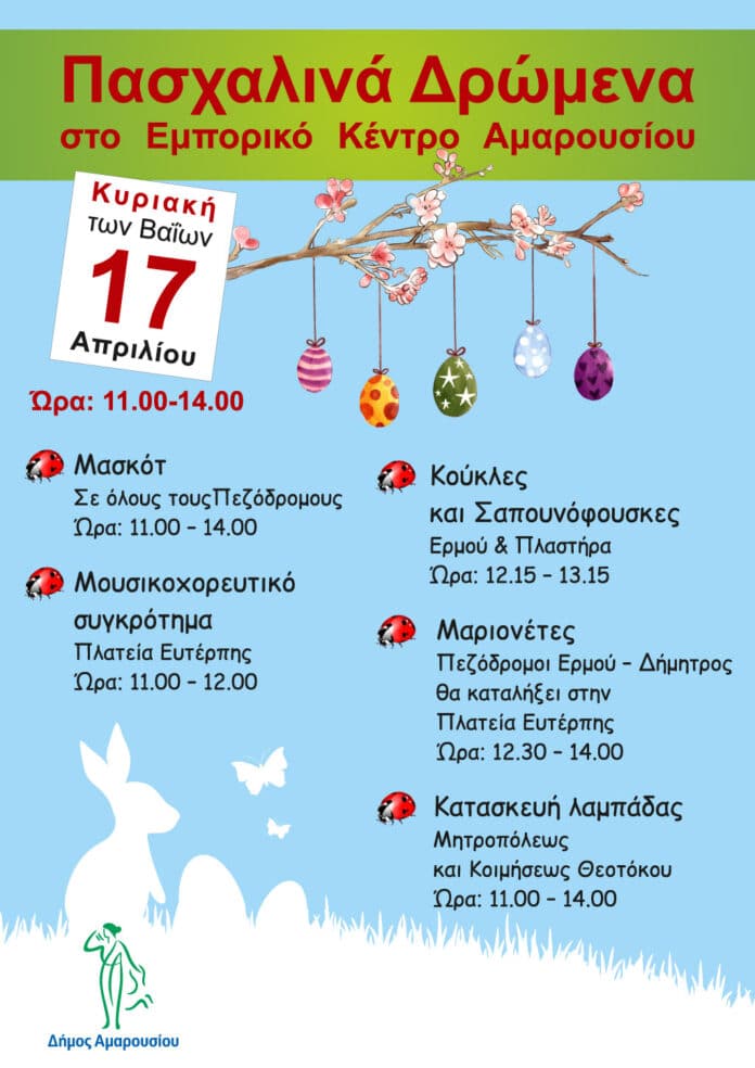 Ο Δήμαρχος Αμαρουσίου Θεόδωρος Αμπατζόγλου και ο Αντιδήμαρχος Αθλητισμού και Πολιτισμού Γιάννης Νικολαράκος προσκαλούν τους Μαρουσιώτες να επισκεφτούν το Εμπορικό Κέντρο της πόλης την Κυριακή Κυριακή των Βαΐων 17 Απριλίου 2022 11:00 – 14:00, όπου θα λάβουν χώρα εορταστικά Πασχαλινά δρώμενα.