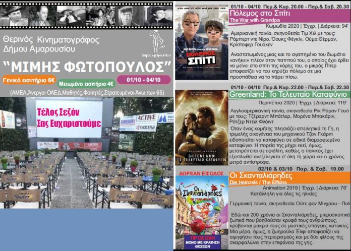 Το θερινό σινεμά λειτούργησε με όλα τα μέτρα προστασίας για τον κορονοϊό και έτσι ο κόσμος του Αμαρουσίου -και όχι μόνο- έδειξε εμπιστοσύνη και κάθε βράδυ η προσέλευση του κόσμου ήταν μεγάλη τηρώντας πάντα τα υγειονομικά πρωτόκολλα. Ταινίες μεγάλου ενδιαφέροντος για μικρούς και για μεγάλους κράτησε αμείωτο το ενδιαφέρον του κοινού , τόσο τις θερινές βραδιές όσο και τις φθινοπωρινές , αφού μέχρι σήμερα παίζονται οι τελευταίες προβολές. Επίσης πολύ μεργάλη επιτυχία είχαν και οι παιδικές παραστάσεις του καραγκιόζη που διοργανώνονταν κάθε τετάρτη απόγευμα με την συμμετοχή διακεκριμένων καραγκιοζοπαιχτών. Δικαιολογημένα λοιπόν, ο Δημοτικός θερινός Κινηματογράφος “Μίμης Φωτόπουλος” παραμένει στην κορυφή της προτίμησης του κόσμου ακόμη και σε αυτή τη δύσκολη συγκυρία, και ανανεώνει το ραντεβού του για το επόμενο καλοκαίρι!