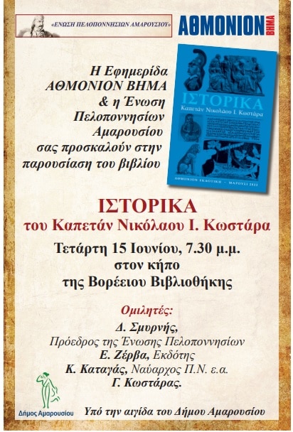 ΜΑΡΟΥΣΙΚοινωνικά Πρόσκληση σε παρουσίαση βιβλίου Από ΑΘΜΟΝΙΟΝΒΗΜΑ - 14 Ιουνίου 2022 0 μερίδιο FacebookTwitterPinterestWhatsApp Σας προσκαλούμε στην παρουσίαση του βιβλίου του Καπετάν Νικόλαου Κωστάρα με τίτλο Ιστορικά που εξέδωσε η Εφημερίδα ΑΘΜΟΝΙΟΝ ΒΗΜΑ. Τετάρτη 15 Ιουνίου, 7.30 στον κήπο της Βορέειου Βιβλιοθήκης