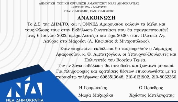 Πρόσκληση σε συνεστίαση από την ΔΗΜ. ΤΟ. ΝΔ Αμαρουσίου