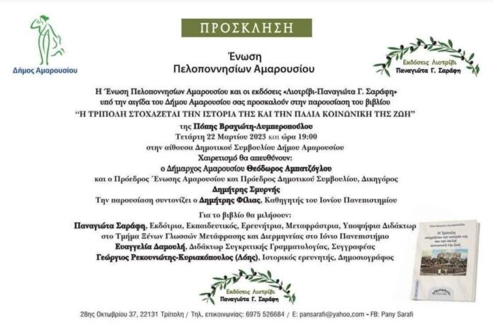Η Ένωση Πελοποννησίων Αμαρουσίου και οι εκδόσεις «Λιοτρίβι-Παναγιώτα Γ. Σαράφη», υπό την αιγίδα του Δήμου Αμαρουσίου, σας προσκαλούν στην παρουσίαση του βιβλίου με τίτλο: