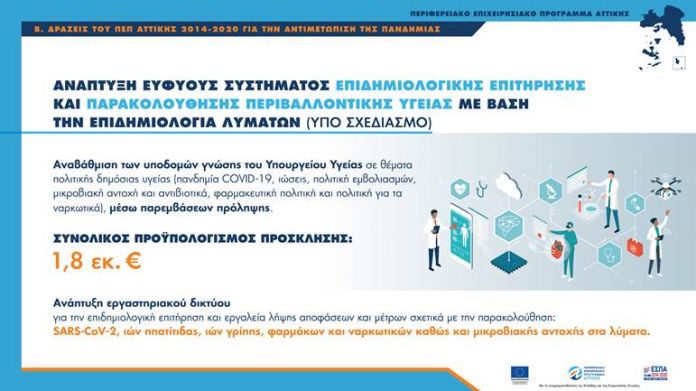 Ειδικότερα, η Περιφέρεια Αττικής, στην πρόσκληση που εκδόθηκε στις 3/3/2021 (ΑΔΑ: 6Φ007Λ7-Γ3Ω) καλεί τη Γενική Γραμματεία Δημόσιας Υγείας και τον Εθνικό Οργανισμό Δημόσιας Υγείας να υποβάλει πρόταση χρηματοδότησης από το Επιχειρησιακό Πρόγραμμα Αττική 2014-2020 για την ανάπτυξη και λειτουργία ενός Ευφυούς Συστήματος Επιδημιολογικής Επιτήρησης και Παρακολούθησης Περιβαλλοντικής Υγείας, με βάση την επιδημιολογία των λυμάτων.