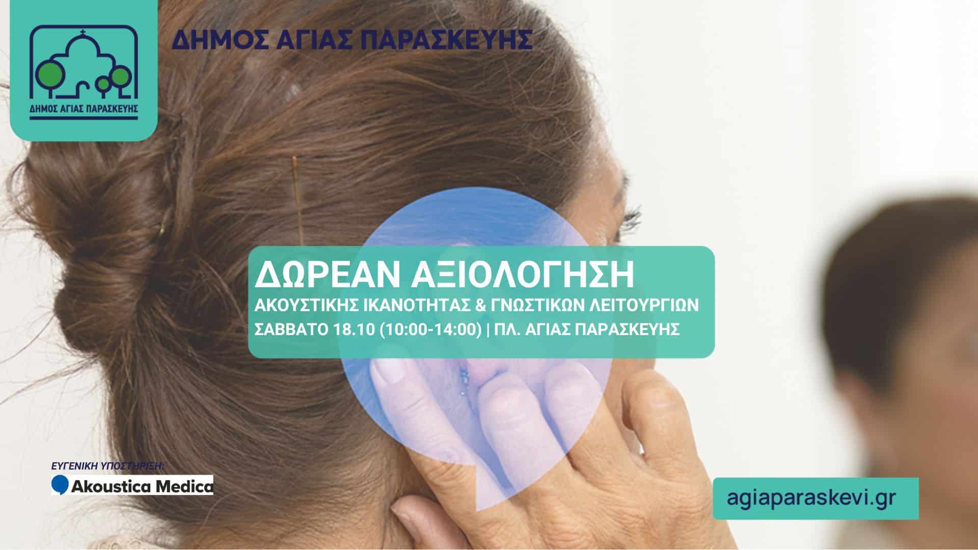 Ο Δήμος Αγίας Παρασκευής, στο πλαίσιο της διαρκούς μέριμνας για την υγεία και την ποιότητα ζωής των πολιτών, σε συνεργασία με την Acoustica Medica, διοργανώνει το Σάββατο 18 Οκτωβρίου από τις 10:00 έως τις 14:00, στην κεντρική πλατεία Αγίας Παρασκευής, δωρεάν σύντομες αξιολογήσεις ακουστικής ικανότητας.