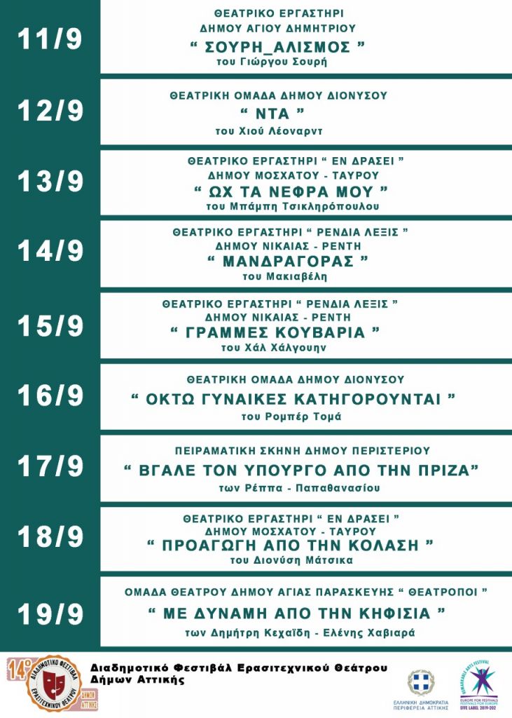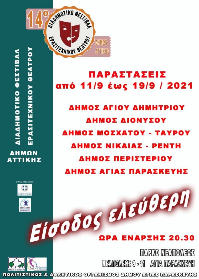 Εννέα (9)  θεατρικές παραστάσεις θα έχουν την ευκαιρία να παρακολουθήσουν μικροί και μεγάλοι από το Σάββατο 11 έως και την Κυριακή 19 Σεπτεμβρίου 2021 στο πάρκο Νεαπόλεως, οδός Νεαπόλεως 9-11, στο πλαίσιο του 14ου  Διαδημοτικού Φεστιβάλ Θεάτρου Δήμων Αττικής.