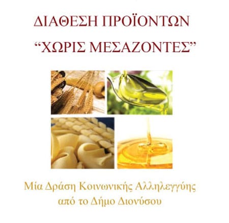 Θα θέλαμε να σας ενημερώσουμε ότι ο Δήμος Διονύσου συνεχίζει τη συμμετοχή του στο καταναλωτικό κίνημα “Χωρίς Μεσάζοντες” με τη διοργάνωση της 99ης κατά σειρά δράσης, που θα πραγματοποιηθεί την Τετάρτη 6 Mαίου 2020 στον Άγ. Στέφανο (επί της οδού Ηρώων Πολυτεχνείου) και ώρες 8.00 έως 14.00.